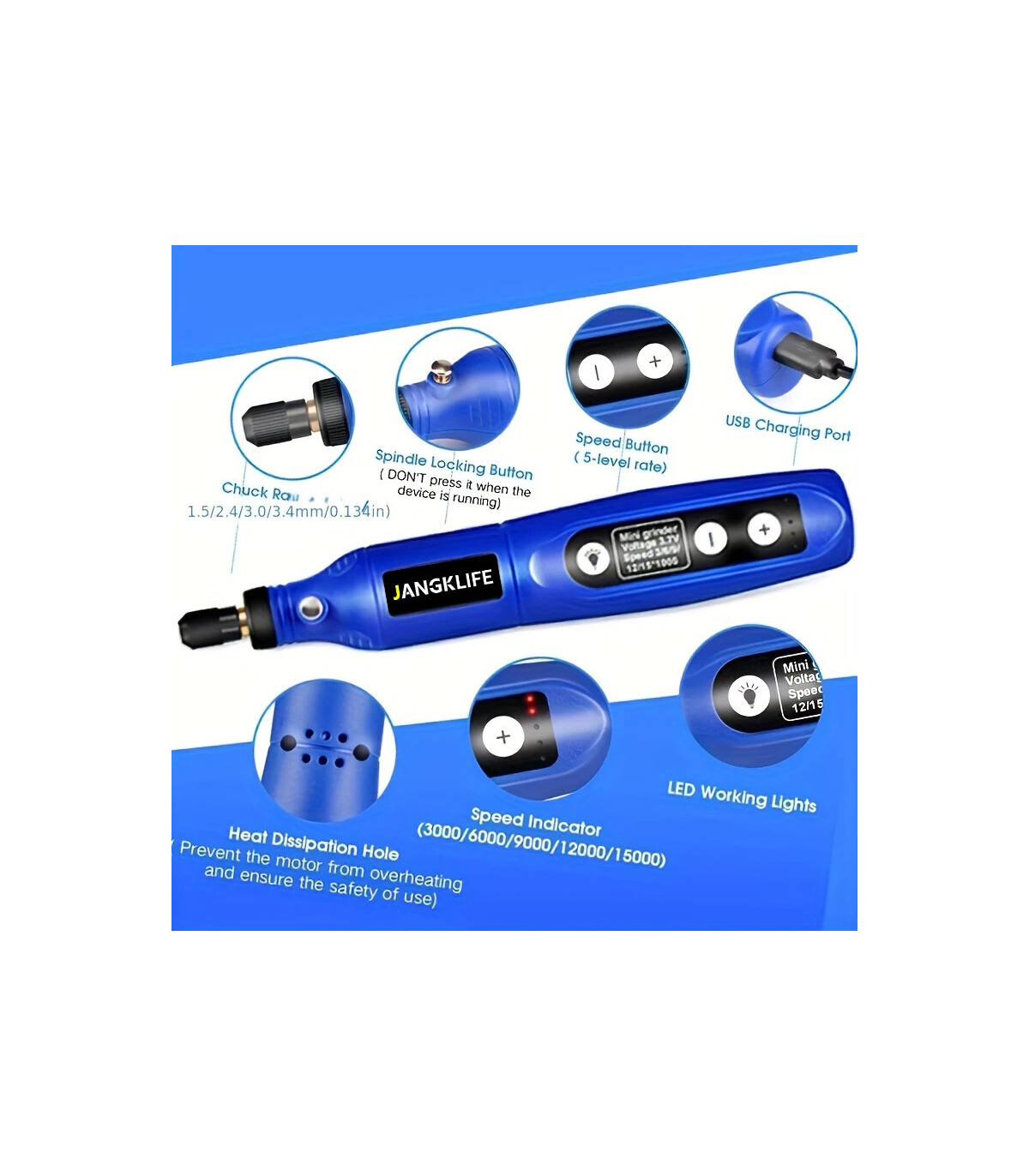 AKIMANIA.COM - [Blue-115pcs] JANGKLIFE Kit de herramientas USB de grabado en madera de bricolaje con bolígrafo rotativo inalámbrico.