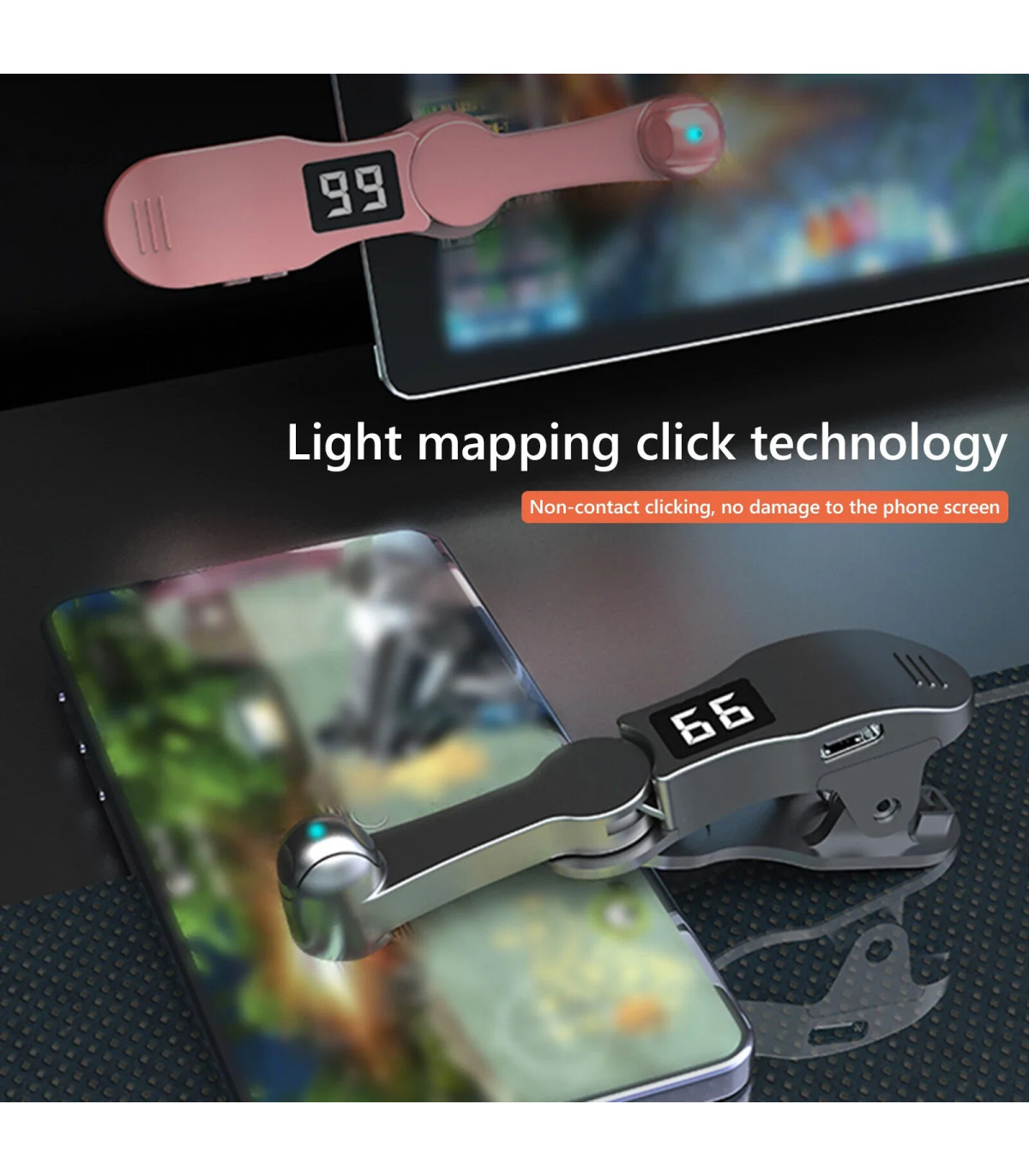 2. Funzionamento ultra silenzioso: I nostri treppiedi tattili per schermi di gioco utilizzano la tecnologia di clic di mappatura spaziale per sostituire il clic meccanico tradizionale, offrendo un funzionamento silenzioso. Ciò non solo prolunga la durata dell'apparecchio, ma evita anche di danneggiare lo schermo del tuo telefono, garantendo sensibilità e stabilità durante l'uso.
